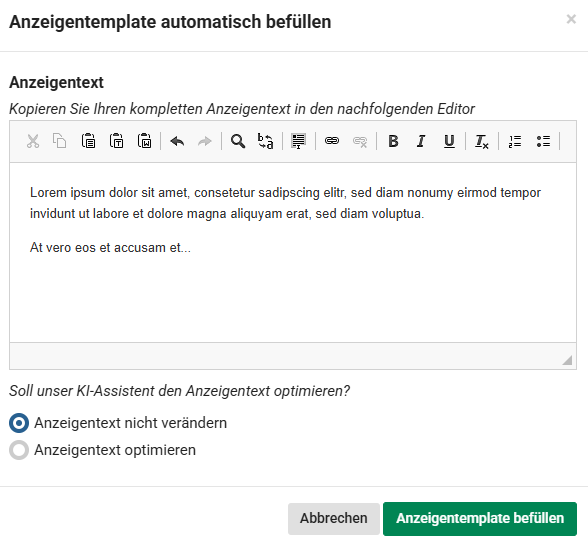 In der Bearbeitung der Stellenanzeige gibt es oberhalb der Eingabe des Anzeigentextes nun die Möglichkeit, sich das Anzeigentemplate automatisch befüllen zu lassen. Wenn bereits ein vollständiger Anzeigentext oder Stichpunkte (z. B. aus einem Word-Dokument, PDF o. Ä.) vorliegen, können Sie diese einfügen. Unser KI-Assistent analysiert den Inhalt und überträgt die Informationen in die passenden Eingabefelder des gewählten Templates.