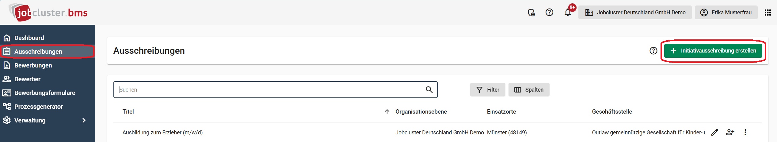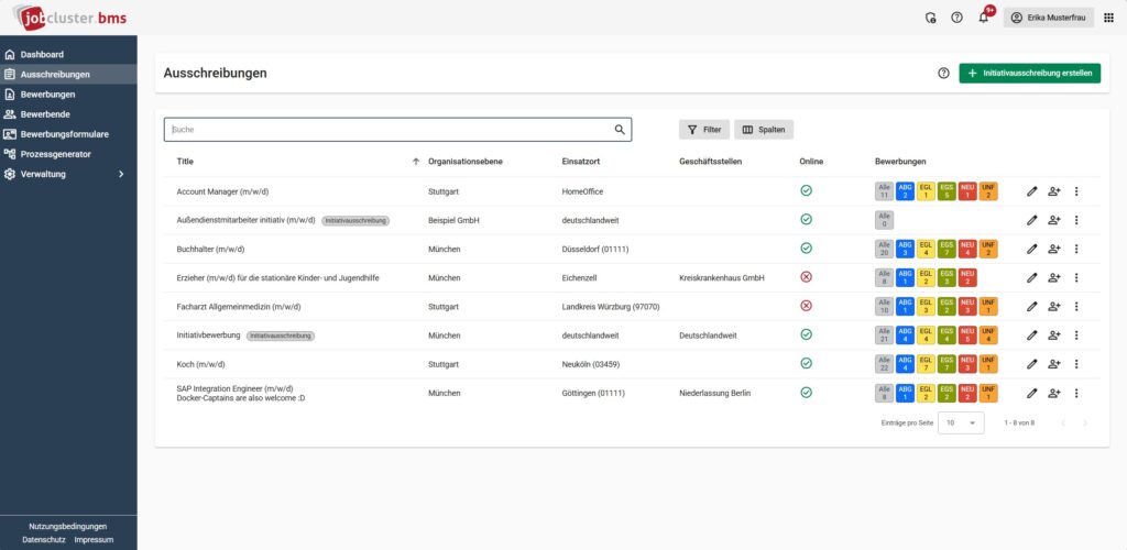 Ausschreibungen werden entweder durch den One-Click-Recruiter automatisch in das Bewerbermanagementsystem (BMS) übernommen oder durch die Schnittstelle (API) direkt im System erstellt. Das manuelle anlegen von Ausschreibungen direkt im BMS ist nur für Initiativausschreibungen möglich.