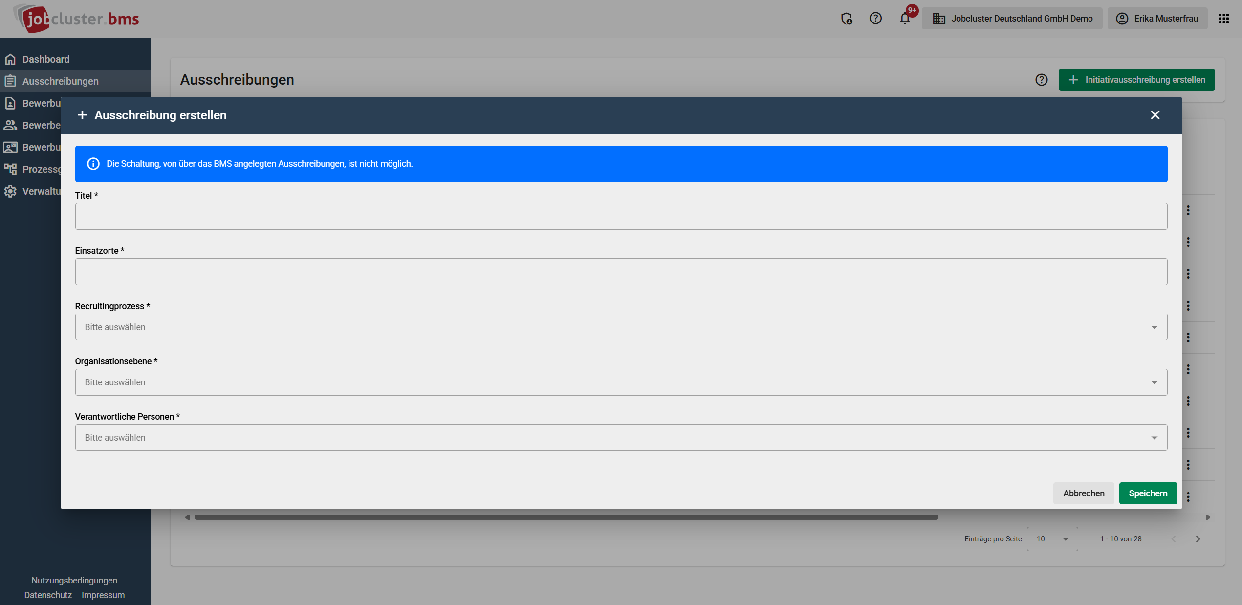 Das Löschen von Ausschreibungen direkt im BMS ist nicht möglich. Wenn Sie eine Ausschreibung löschen möchten, müssen Sie dies in dem System tun, aus dem die Ausschreibung in das BMS übertragen wurden. Ausschreibungen mit Bewerbungen können nicht gelöscht werden.