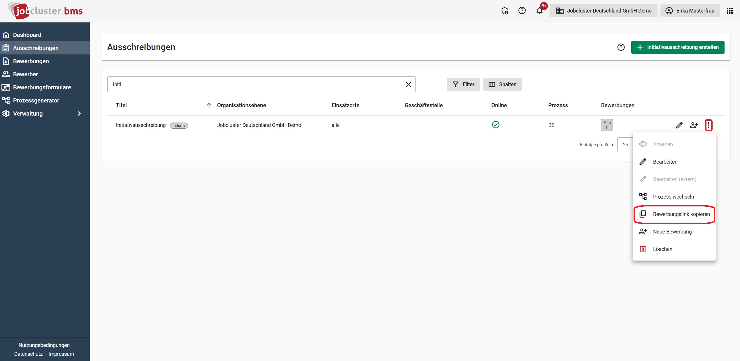 Anschließend ist es möglich, den Bewerbungslink zu kopieren und diesen an beliebigen Ort, z.B. in einem Button im Karriereportal, zu hinterlegen. Eingehende Bewerbungen werden dann direkt im BMS angelegt und der Initiativausschreibung zugeordnet. Der Bewerbungslink kann durch einen Klick auf die drei Punkte der Initiativausschreibung und anschließender Auswahl der Option Bewerbungslink kopieren kopiert werden.