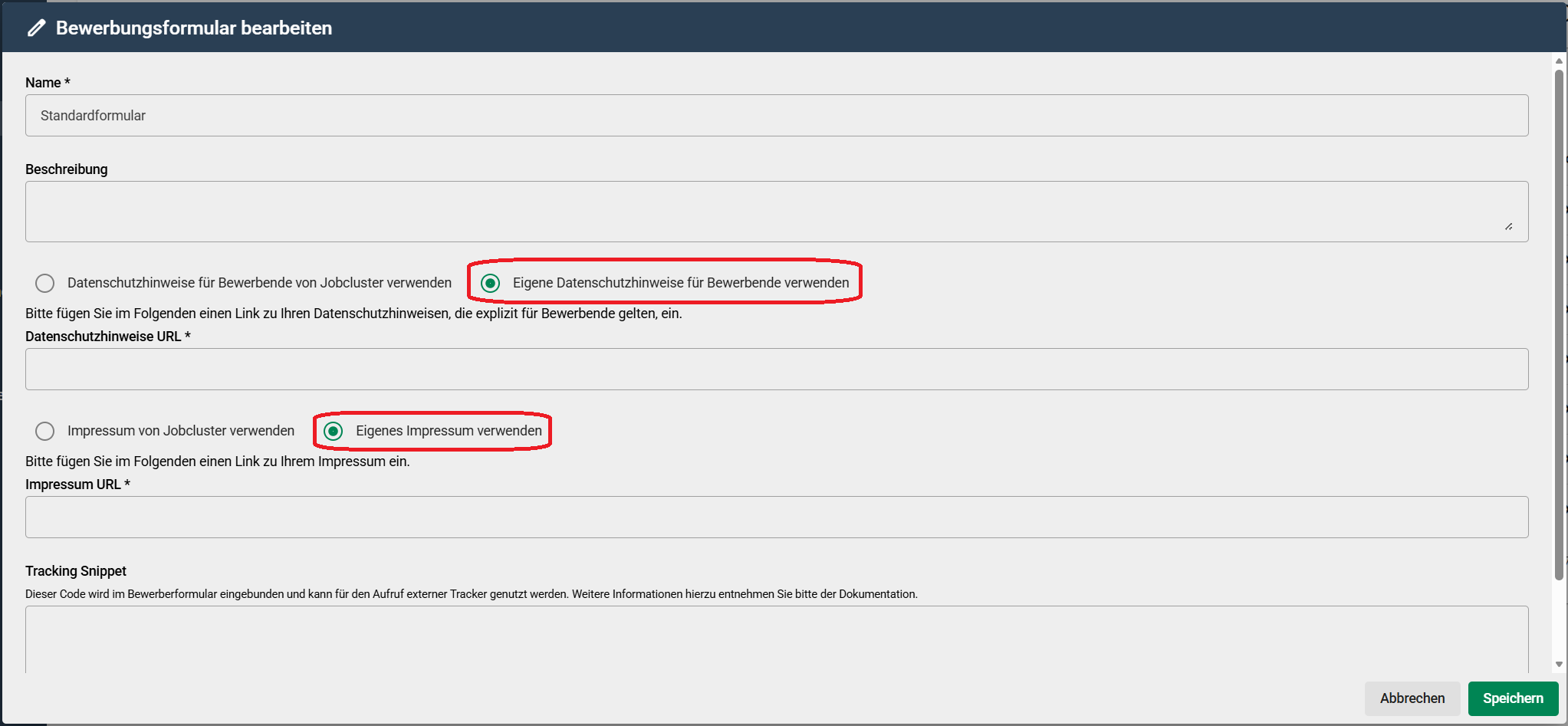 Die Datenschutzhinweise und das Impressum innerhalb des Bewerberformulars können über die Bearbeiten Aktion des Bewerberformulars und anschließender Auswahl der Option Eigene Datenschutzhinweise für Bewerbende verwenden bzw. Eigenes Impressum verwenden angepasst werden. In den jeweils erscheinenden Textzeilen kann eine URL hinterlegt werden.