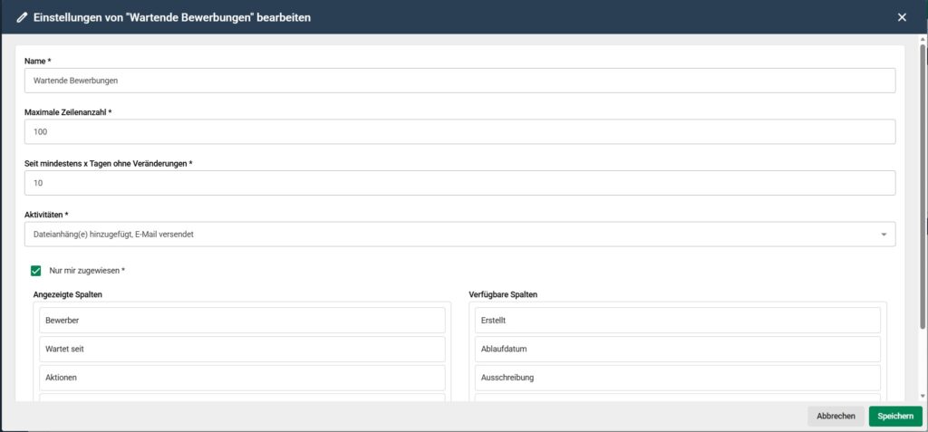 Bei Auswahl der Checkbox nur mir zugewiesen werden nur die Bewerbungen angezeigt, bei denen der aktuelle Nutzer als verantwortliche Person hinterlegt ist. Zusätzlich können die Angezeigten Spalten, durchs Klicken und Herüberziehen der Verfügbaren Spalten, angepasst werden.