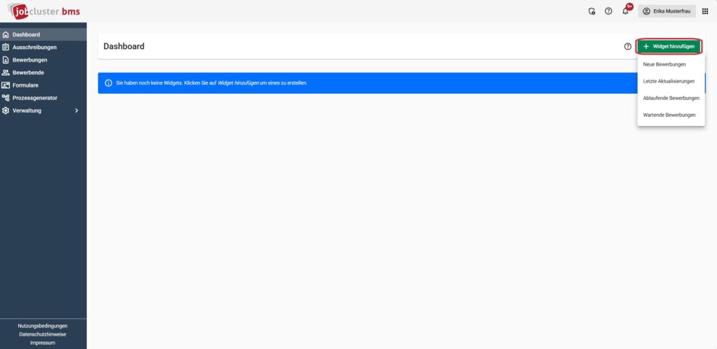 Das Dashboard im Jobcluster Bewerbermanagementsystem (BMS) gibt Ihnen einen ersten Überblick über neue Bewerbungen, zuletzt aktualisierte Bewerbungen und weitere aktuelle Themen, die möglicherweise Ihre Aufmerksamkeit benötigen.